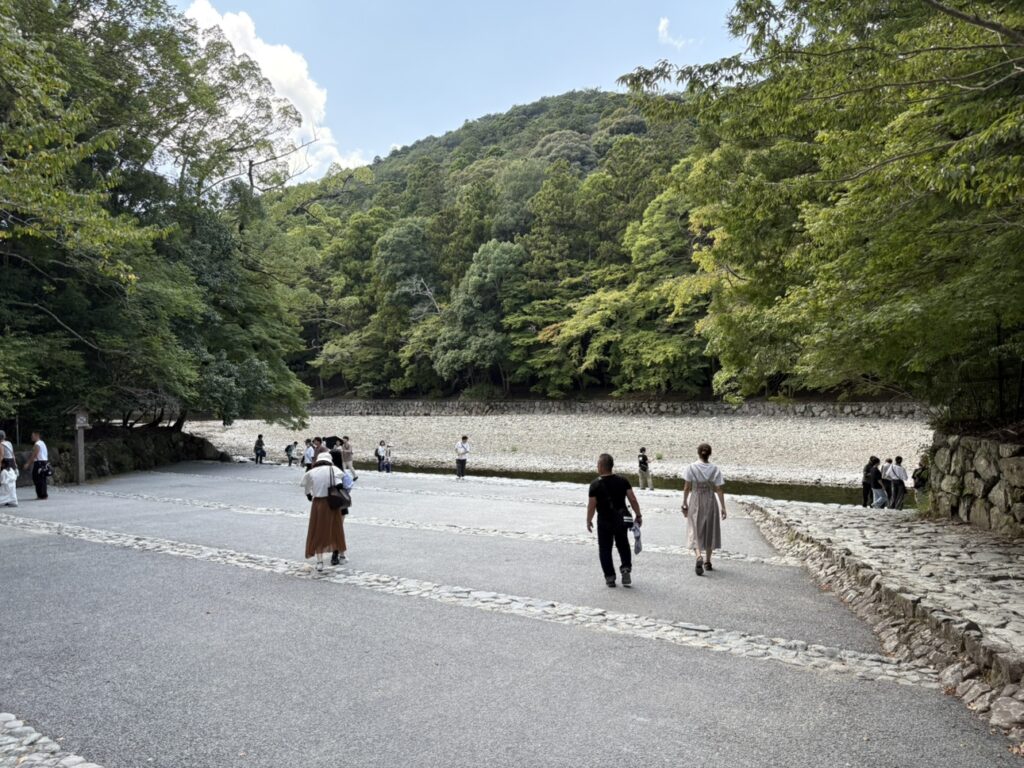 玄関口である宇治橋を渡った先の五十鈴川沿いに広がる広大な庭園があります。これが『神苑』です。↓