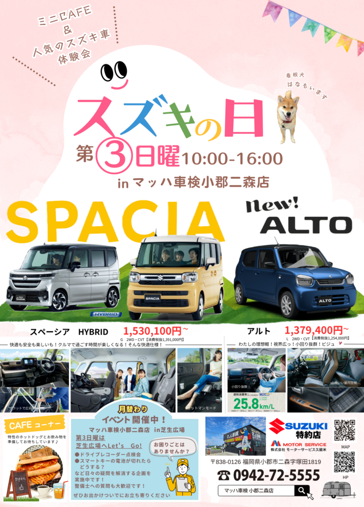 ほかにもスズキ車の展示やミニカフェもオープンしています。お買い物帰りや、お子様とのドライブついでにシュッと立ち寄ってください。