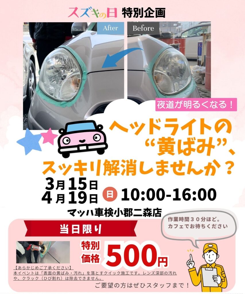 【イベント】あなたの愛車のヘッドライト、くすんでいませんか? 夜道が暗い・車が古く見える…その悩み、ワンコインで解決できるお話。