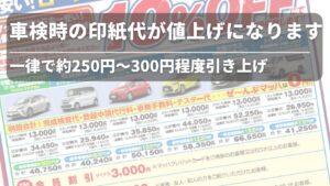 【2026年4月1日より】 自動車の車検(継続検査)にかかる印紙代(法定手数料)が一律で約250円〜300円程度引き上げられます。